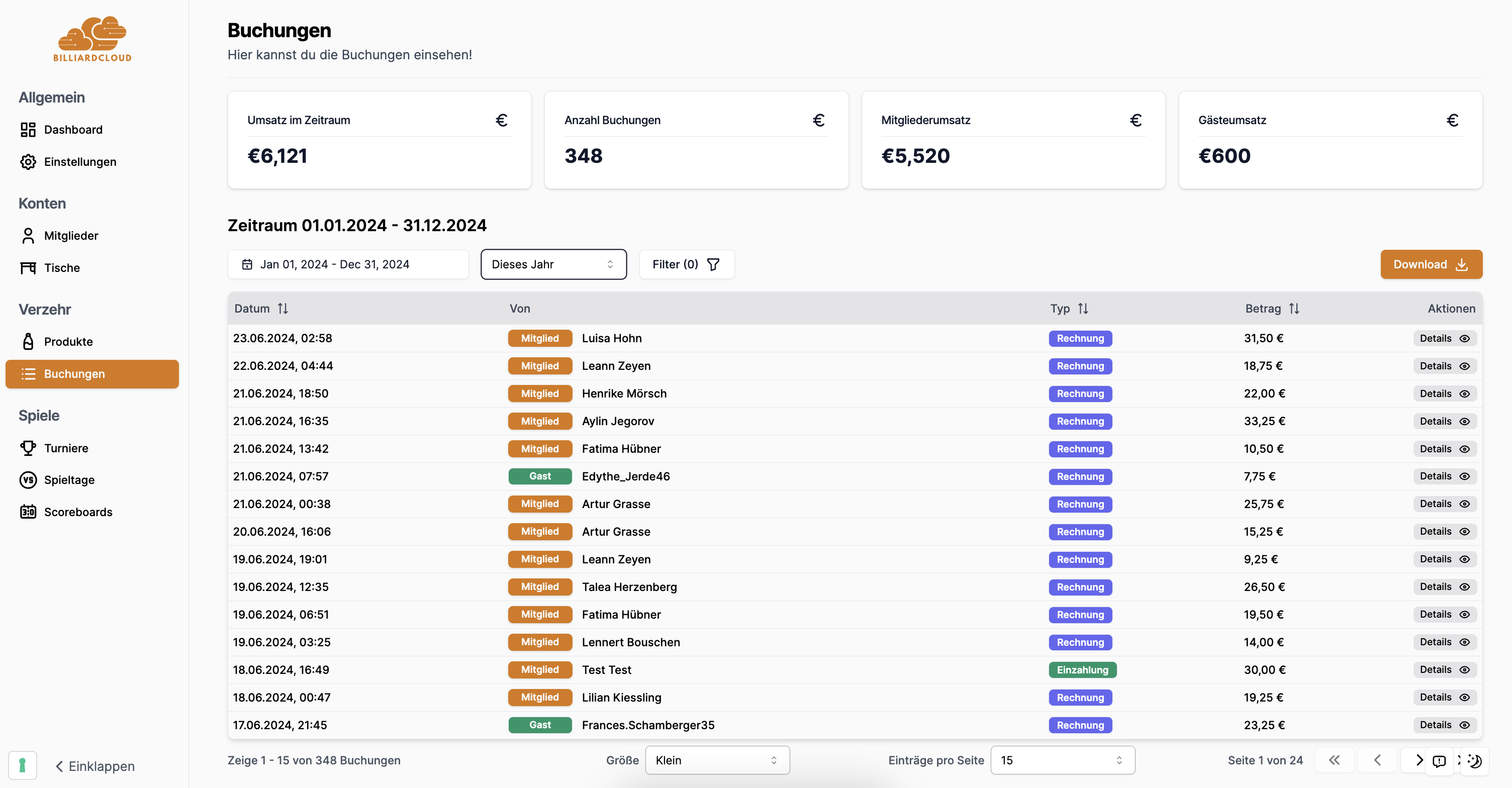 Du siehst alle Buchungen auf einen Blick und kannst sie nach verschiedenen Kriterien filtern und sortieren. Lösche Buchungen von Mitgliedern oder Gästen, wenn diese nicht korrekt sind. Du kannst sie auch exportieren, um sie in anderen Programmen weiterzuverarbeiten.