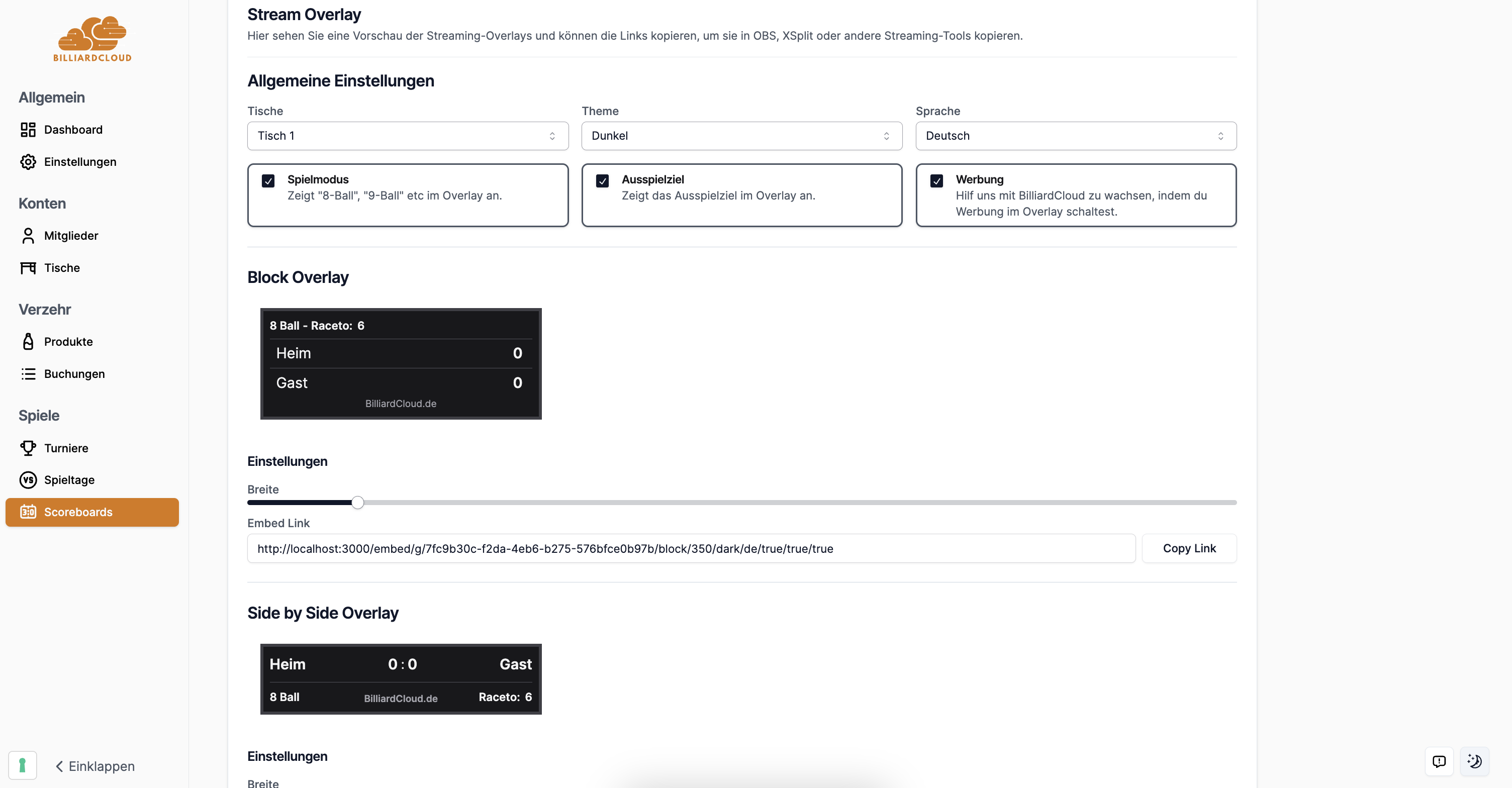 Für jeden Tisch-Account im Verein wird automatisch eine LiveStream Overlay URL generiert. Diese URL kann im OBS oder anderen Streaming-Programmen eingefügt werden. So können die Spielergebnisse im Livestream verwendet werden.