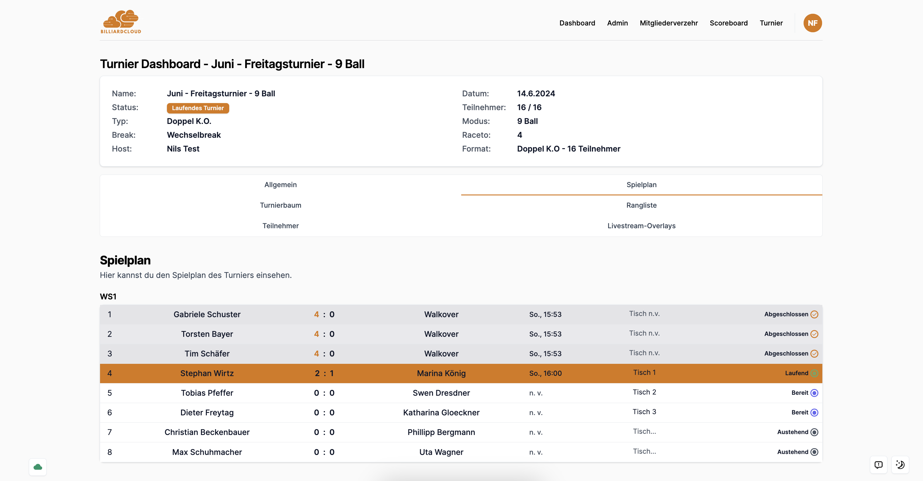 Turnierleitung so einfach wie nie zuvor. Gehe durch den Turnierplan und plane die Spiele auf den Tischen. Du kannst auch die Ergebnisse der Spiele direkt eintragen und die Spielergebnisse verwalten.