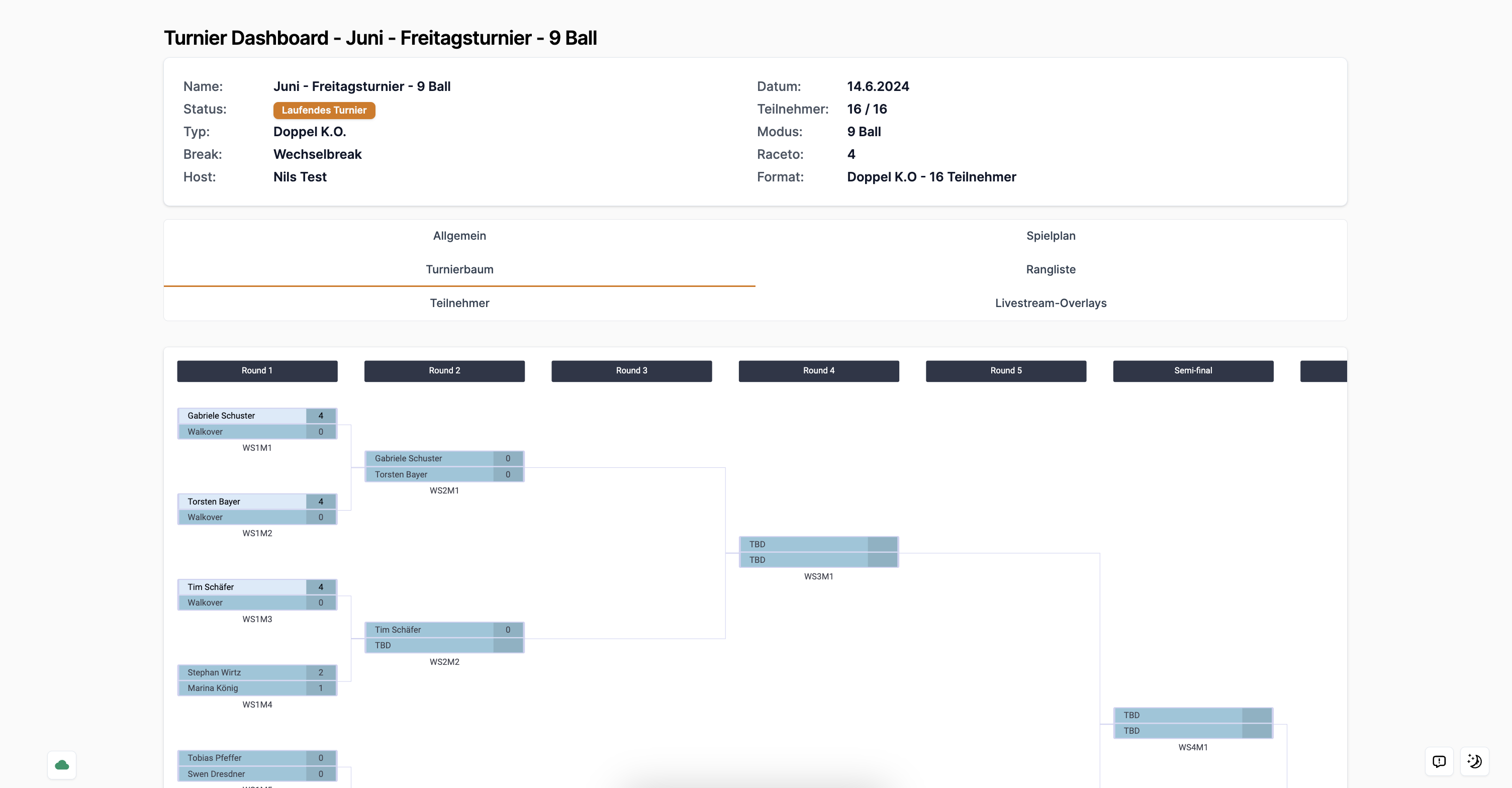 Für jedes Turnier im Einfach- und Doppel-KO-System wird automatisch ein Turnierbaum erstellt. Dieser ist auch auf der Live-Seite verfügbar. Diese Seite kann mit Teilnehmern und Zuschauern geteilt werden.